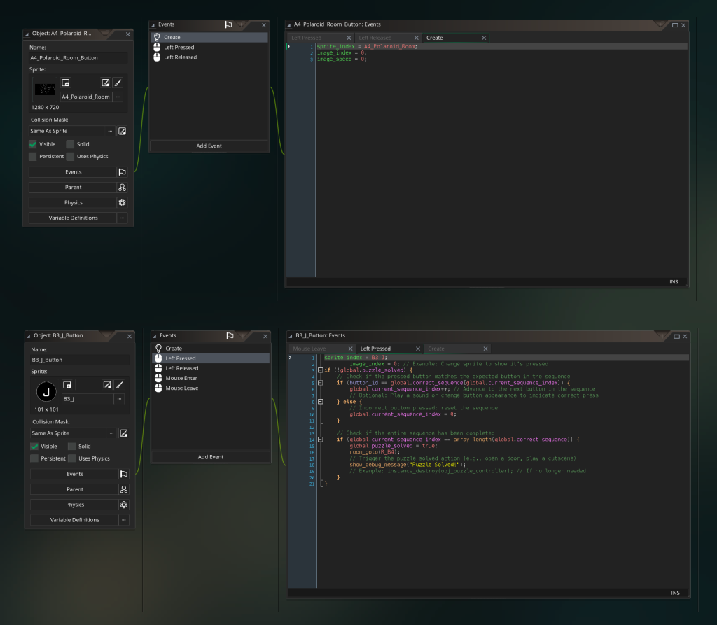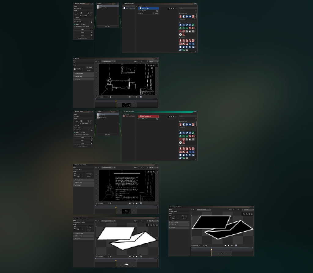 I did quite a bit of research on different game building platforms, and ended up deciding on Game Maker Studio. I highly recommend the program, it’s great for beginners as it has an optional visual coding interface (though I ended up sticking to the actual code most of the time as it was faster and a lot of what I needed to do required custom code). It was my first time using the program, so there’s A LOT I would do differently next time, since I have my bearings. Most notably, I would improve my organization system.