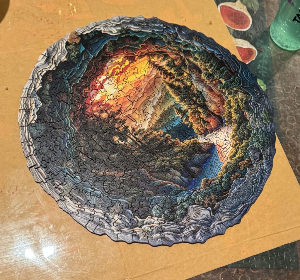 So, when Christmas rolled around last year, I decided to make it a tradition. Once again, I hid the presents and created a series of riddles and coded messages (this time incorporating nyctography), but I wanted to challenge myself to make it more complicated. So, I decided I’d make a theme to my complexity each year. That year, I decided my theme would be “jigsaw puzzles”. I got an unusual shaped puzzle, it was round with jagged pieces so it was nearly impossible to tell what was an edge piece from a middle piece. Then, I spent hours putting it together one night when he was working late. Once I had enough of it assembled, I flipped it over and added more coded messages to the back! He had a great time solving the puzzles and riddles, and once again I loved watching him excitedly working his way through my christmas scavenger hunt.